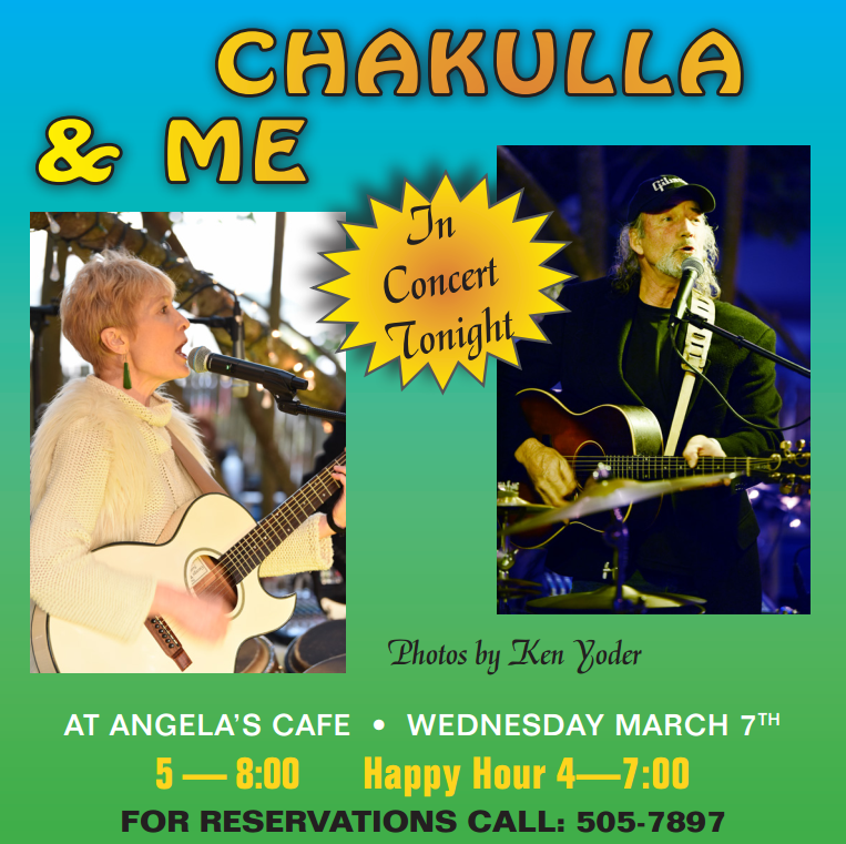 “Chakulla and Me” in Concert in the Garden at Angela’s Cafe Italiano in Beautiful downtown Punta Gorda, Florida This Event is FREE! Call for reservations: (941) 505-7897