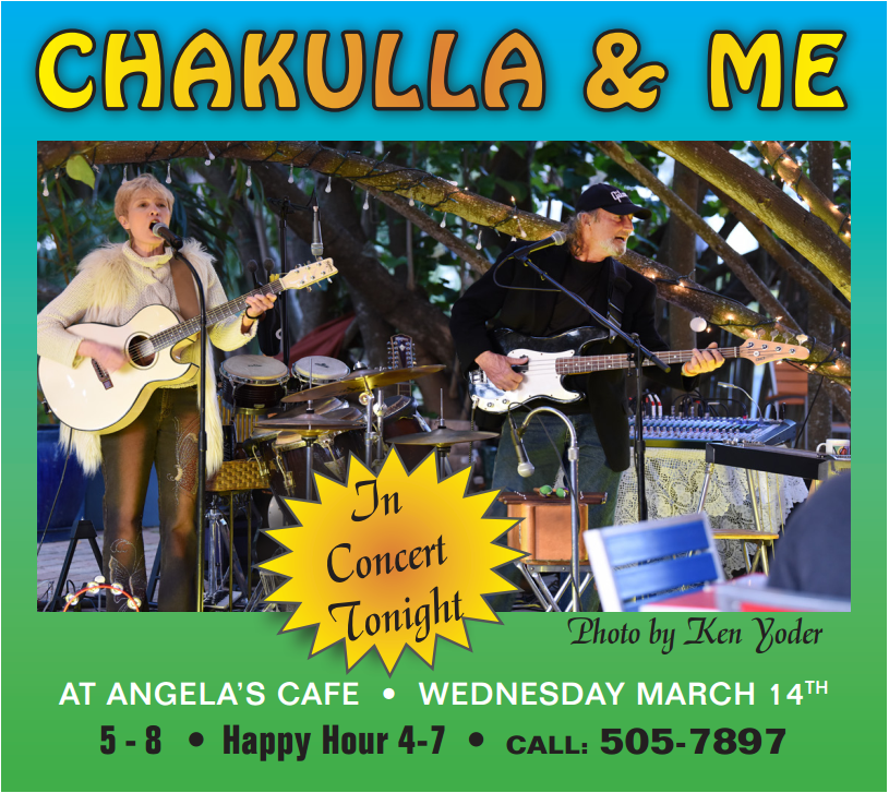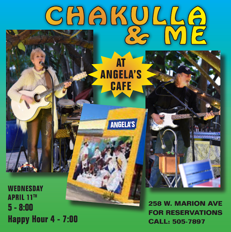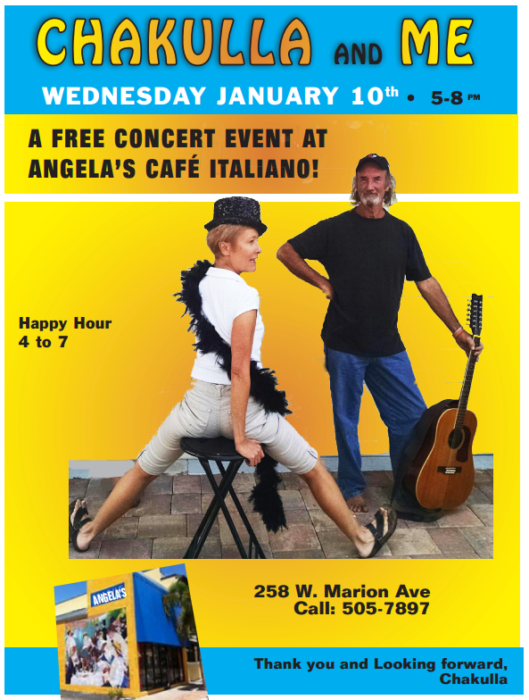 “Chakulla and Me” in Concert in the Garden at Angela’s Cafe Italiano in Beautiful downtown Punta Gorda, Florida This Event is FREE! Call for reservations: (941) 505-7897