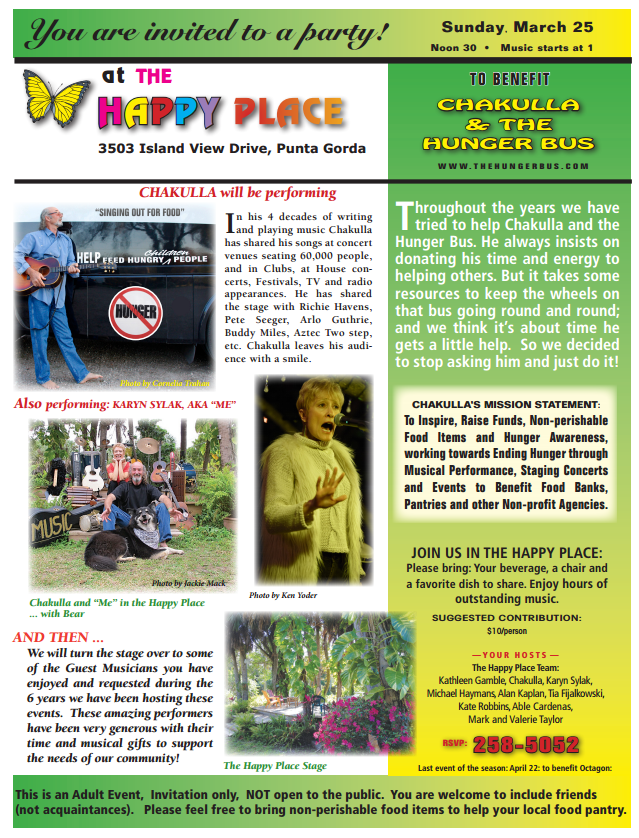 Fundraiser Concert: “Party with a Purpose”! Advanced Auto on 1183 N. Toledo Blade Blvd. in North Port, Florida is teaming up with the Hunger Bus having a Party to Benefit: the All Faiths Food Bank! Burgers, Dogs, Sodas and Water all for a dollar donation each. Bouncy House, Rock Painting, Prizes and Give aways. Family Fun and celebration! Chakulla will be making Music throughout afternoon! This Event is FREE! Monetary and non-perishable Donations excepted! Help Feed Hungry Children/People!